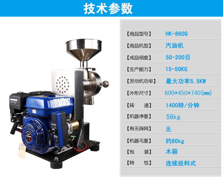 +磨粉机”,不需连接电源,通过汽油发动机传动,适合流动式磨粉作业。本机可通过控制发动机油门的大小,